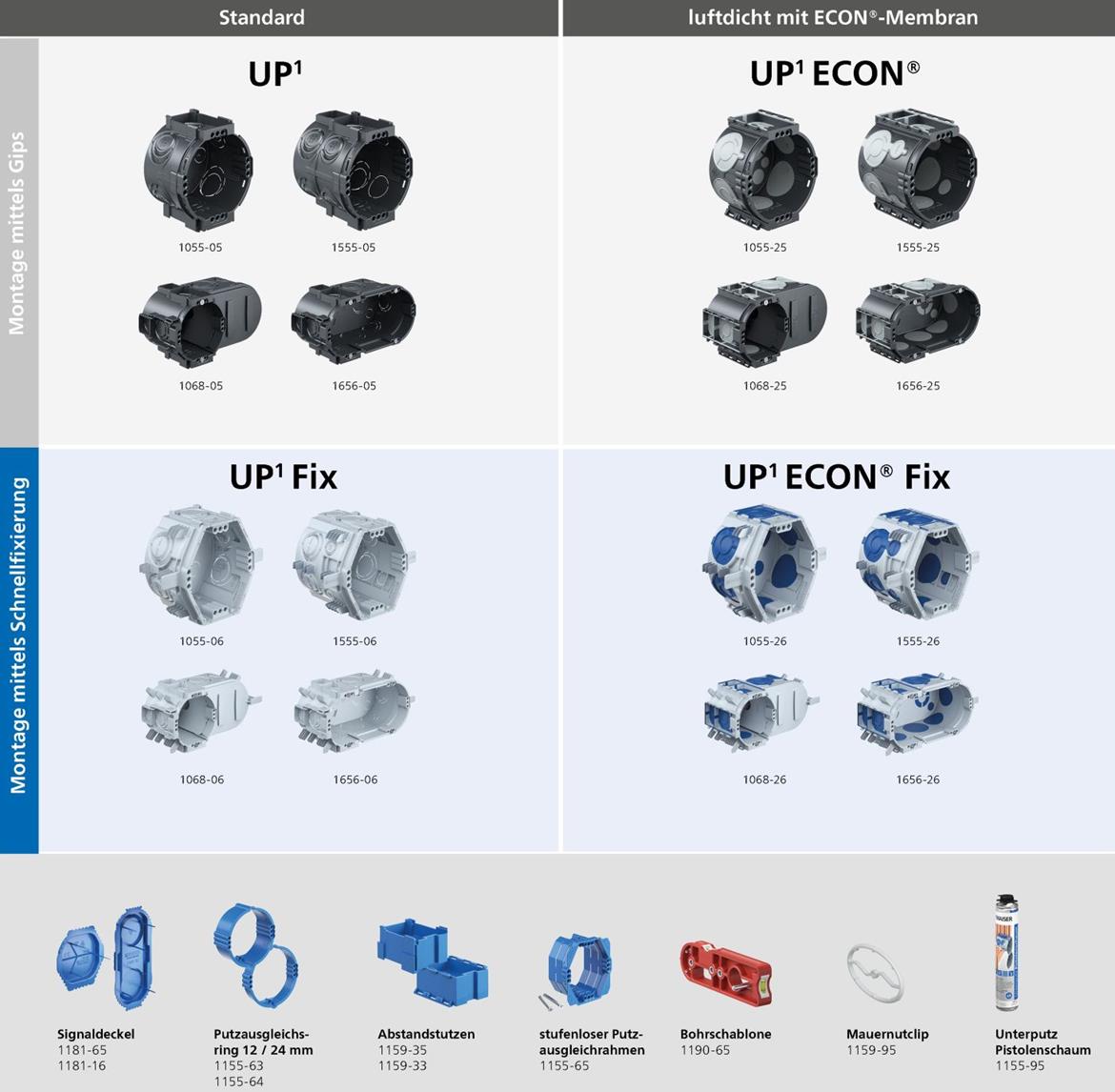 Ob klassische Montage mit Gips, luftdichte Ausführung oder die schnelle, saubere Installation mit innovativen Klemmrippen – die UP1-Familie bietet maximale Flexibilität für jede Anforderung auf der Baustelle. Durchdachte Features wie die bodennahe Durchverdrahtung, 4-3-fach Schraubdome oder bis zu 25 % mehr Installationsvolumen machen den Unterschied – spürbar in der Praxis, überzeugend im Ergebnis.